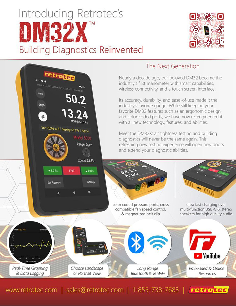 Πριν μια δεκαετία, το DM32 έγινε το πρώτο μανόμετρο της βιομηχανίας με τις έξυπνες ικανότητες του, την ασύρματη σύνδεση του, και την οθόνη αφής. Η ακρίβεια, η ανθεκτικότητα και η ευκολία του στην χρήση, το καθιστούν το αγαπημένο μετρητή της βιομηχανίας. Αν και το DM32 διατηρεί τα χαρακτηριστικά του εργονομικού σχεδιασμού του και της χρωματική κωδικοποίησης της θύρας, τώρα έχει ανασχεδιαστεί με όλες τις νέες τεχνολογίες. Γνωρίστε τις νέες τεχνολογίες. Γνωρίστε το D32Χ: o έλεγχος αεροστεγανότητας και η διαγνωστική των κτιρίων θα αλλάξουν για πάντα. Από την εμπειρία του ελέγχου αεροστεγανότητας διευρύνονται οι διαγνωστικές ικανότητες κατά την μελέτη των κτηρίων.